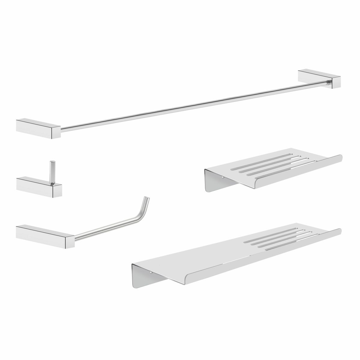 OS ITENS ENVIADOS: 1 Cabide, 1 Porta Papel Higiênico, 1 Porta Toalha Banho 52cm, 1 Saboneteira Suporte Reto em Aço Inox, 1 Prateleira Suporte reto em Aço Inox 30cm, kit de parafusos e manual instrução instalação