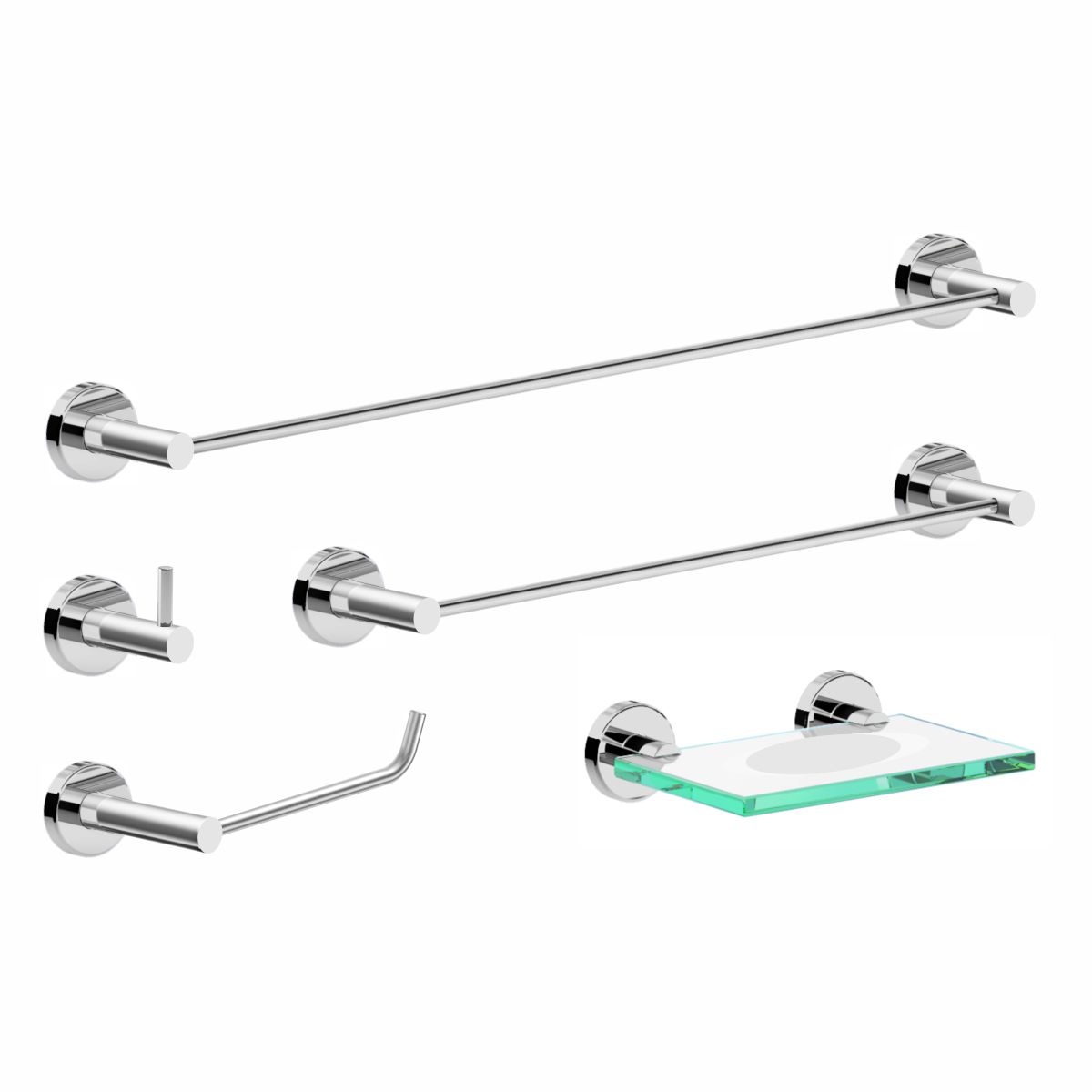 OS ITENS ENVIADOS: 1 Cabide, 1 Porta Papel Higiênico, 1 Porta Toalha Rosto 45cm, 1 Porta Toalha Banho 55cm, 1 Saboneteira em Vidro, kit de parafusos e manual instrução instalação