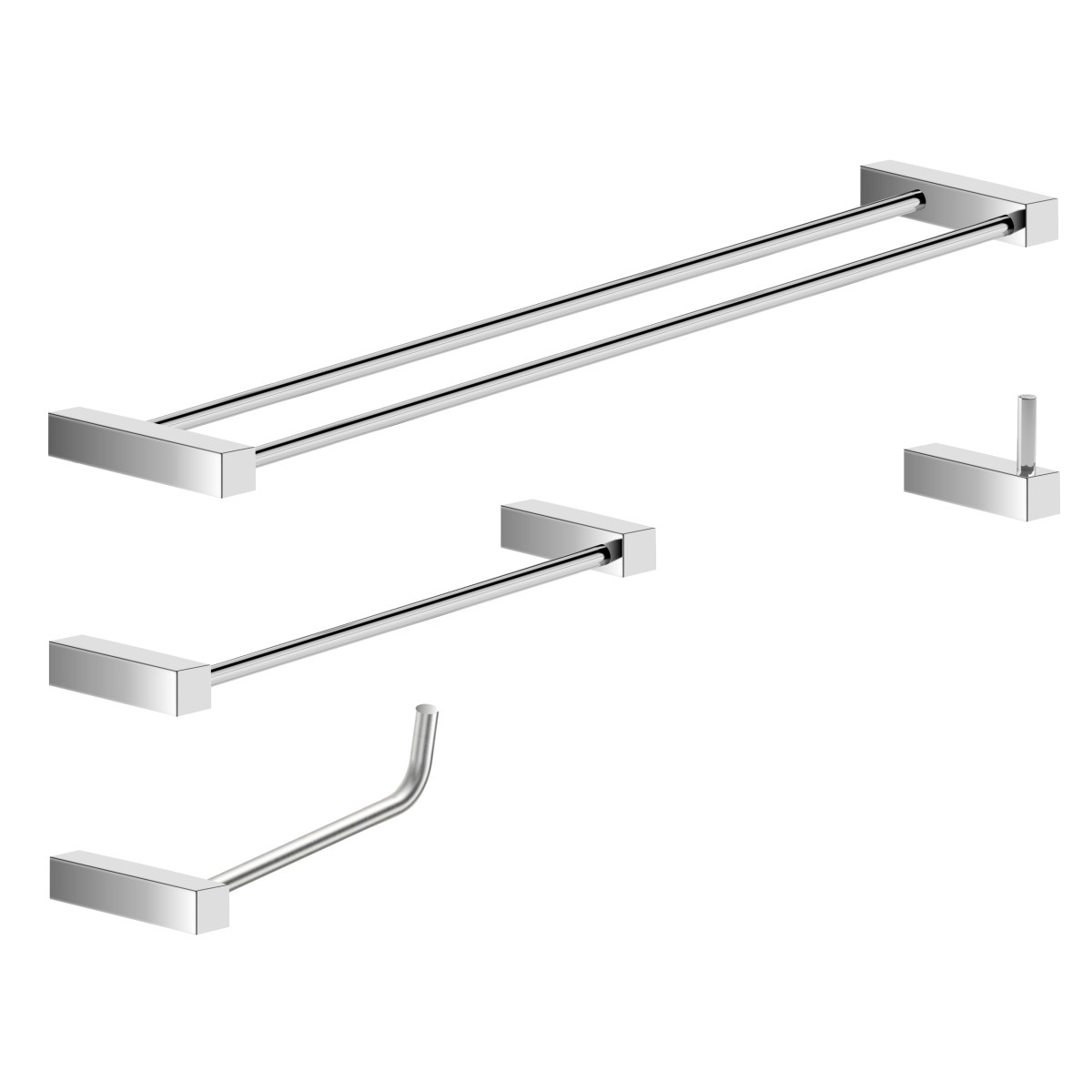 ITENS ENVIADOS: 1 Cabide, 1 Porta Papel Higiênico, 1 Porta Toalha Rosto 32cm, 1 Porta Toalhas Duplo 62cm, kit de parafusos e manual instrução instalação
