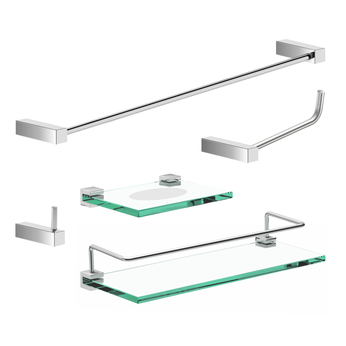 ITENS ENVIADOS:1 Cabide, 1 Porta Papel Higiênico, 1 Porta Toalha Banho 52cm, 1 Saboneteira em Vidro, 1 Prateleira Suporte em Vidro com Proteção 30cm, kit de parafusos e manual instrução instalação
