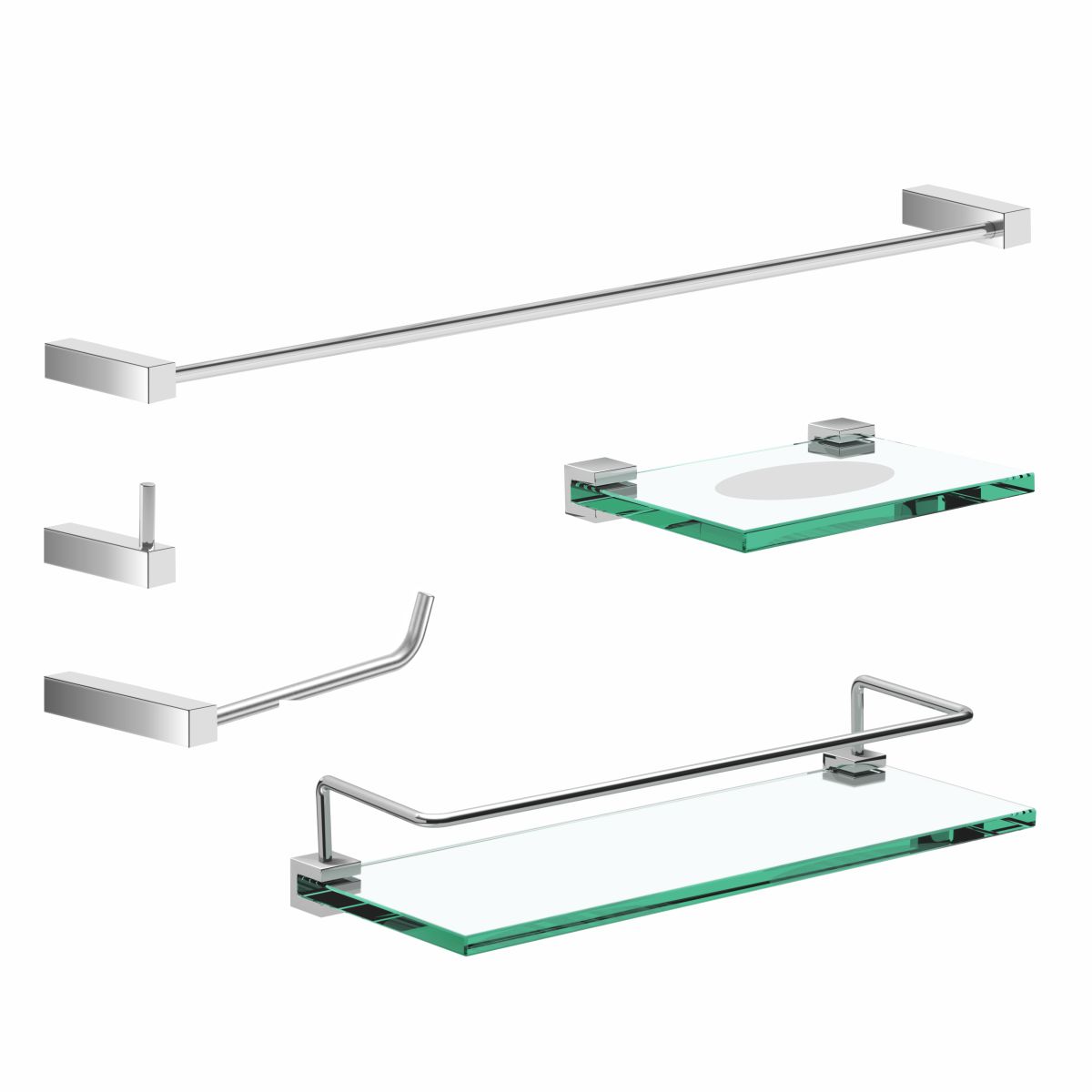 OS ITENS ENVIADOS: 1 Cabide, 1 Porta Papel Higiênico, 1 Porta Toalha Banho 52cm, 1 Saboneteira em Vidro, 1 Prateleira Com Proteção em Vidro 30cm, kit de parafusos e manual instrução instalação