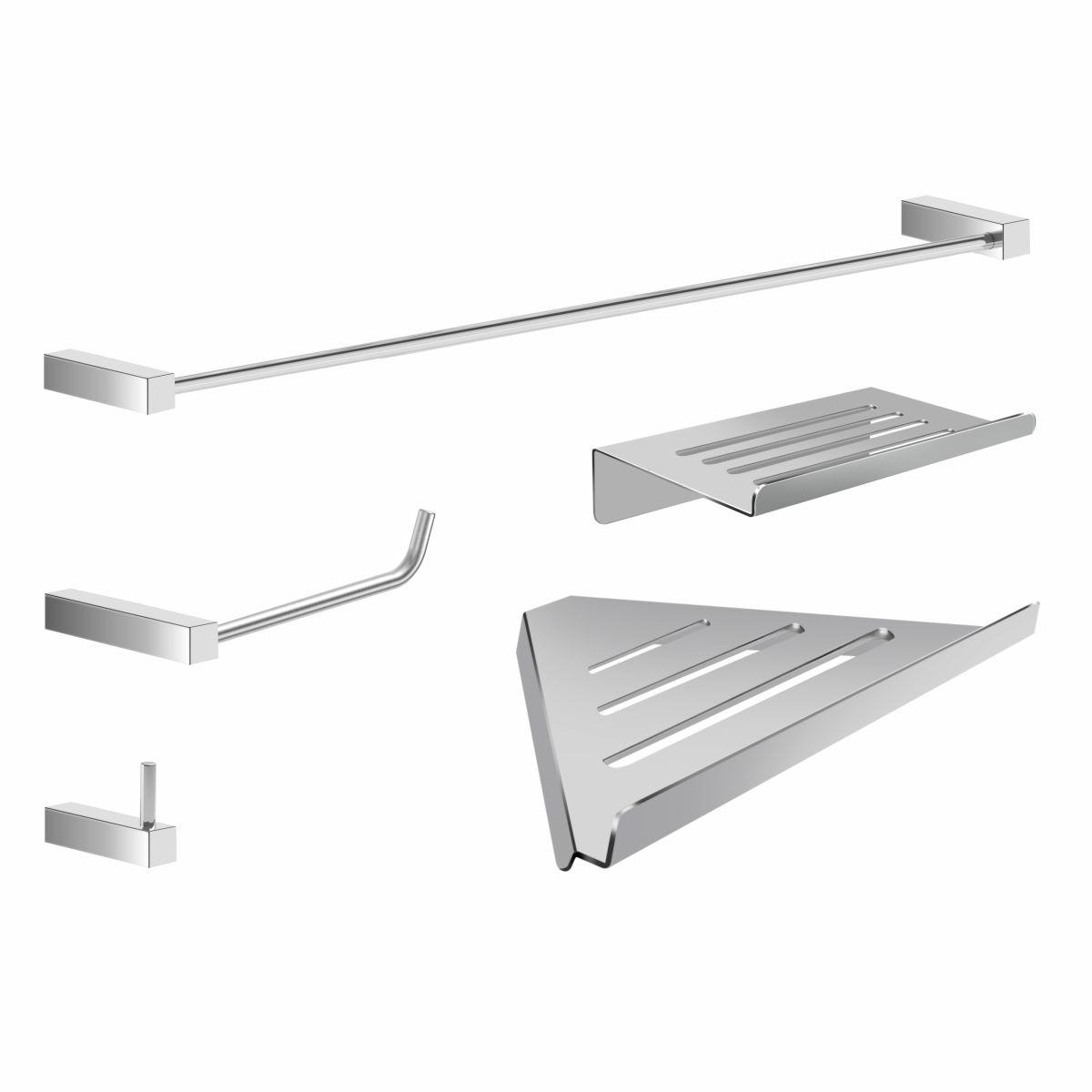 As Medidas Dimensionais cm: (Cabide A5xL2,5xP6) | (Porta Papel Higiênico A2,5xL15xP7) | (Porta Toalha Banho A2,5xL52xP6) | (Saboneteira A4xL14xP9) | (Prateleira Canto A4xL30xP20)